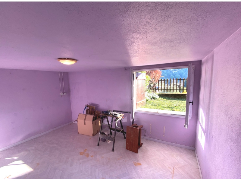 Rez de chaussée surélevé : hall d'entrée, cuisinette-séjour-salon de 49 m2 avec poêle à bois, chambre 1, chambre 2, salle-de-bains, wc, balcon Sud